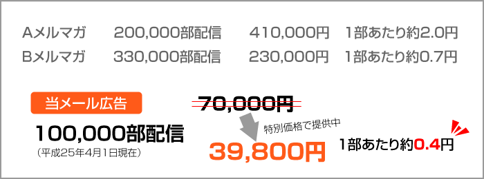 - 広告の内容によって、効果は様々です。格安であること、かつ後払い制をとらせていただいていることもあり、アクセス数が少なかったからという理由での値引きには応じておりませんが、アクセス数は常々把握しており、反応が著しく低い場合などには、原稿内容を変えての再送信などにも応じますので、都度ご相談ください。